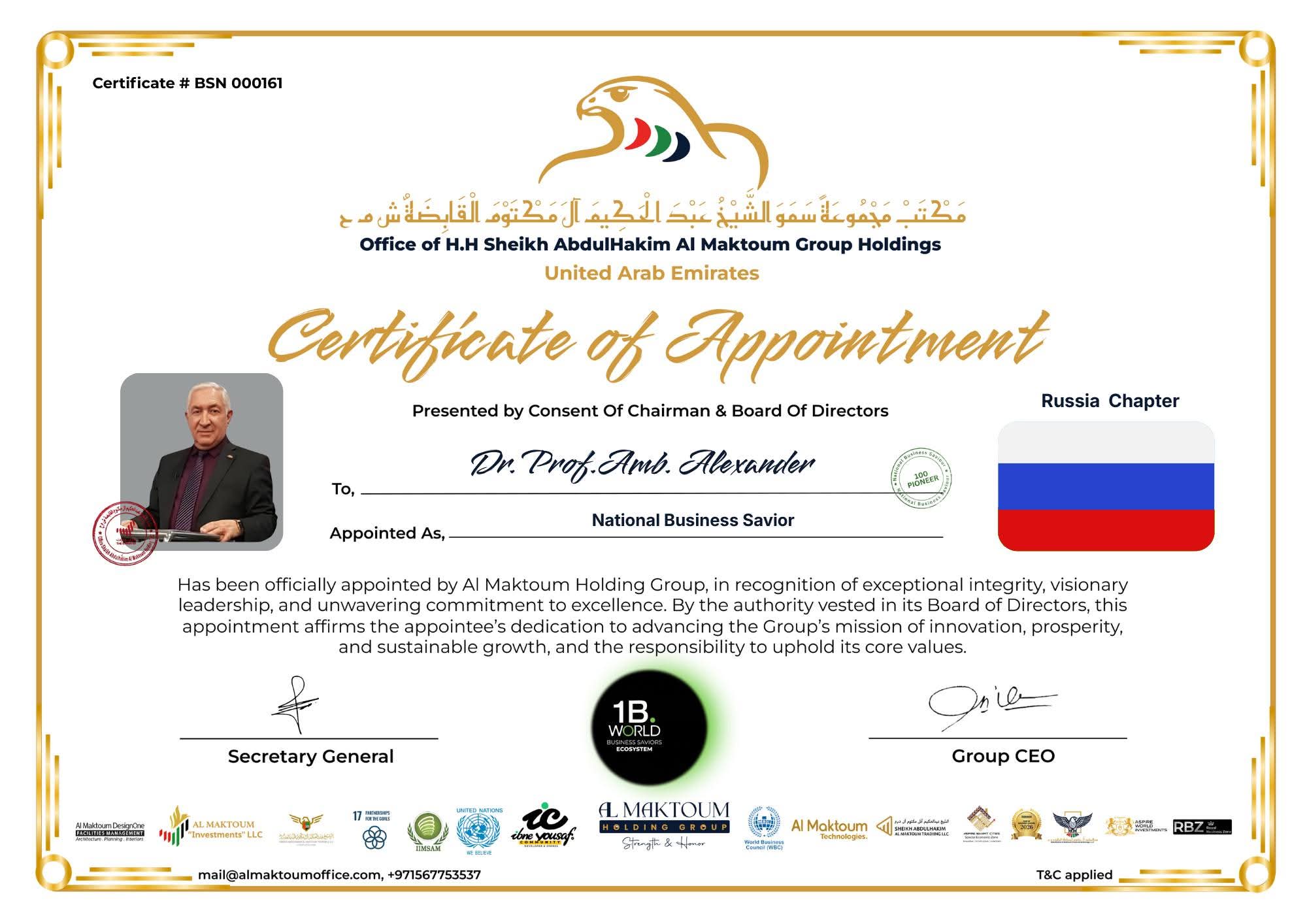 With great respect and sincere gratitude, I accept the recognition and appointment as a 1B Business Savior within the global initiative 1B World. I consider this honor not only as a personal recognition,